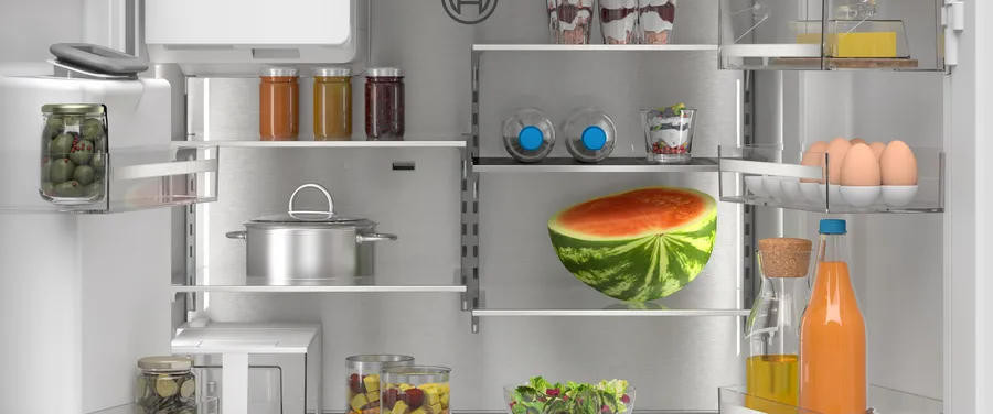 Внутреннее пространство организовано с прицелом на рациональное хранение большого ассортимента продуктов: общая полезная вместимость составляет 574 л, из которых холодильная камера даёт 375 л, а морозильная — 199 л. Внутреннее светодиодное освещение равномерно освещает полки из высокопрочного стекла, среди которых пять расположены в холодильной секции, четыре регулируемые по высоте и одна фиксированная для устойчивых тяжёлых предметов. На дверце размещены пять полочных модулей, включая полку для бутылок и ёмкость для яиц, что помогает распределить нагрузку и сохранить порядок. Зона свежести VitaFresh 0°С предоставляет оптимальные условия для овощей, фруктов и скоропортящихся продуктов, позволяя дольше сохранять текстуру и вкус без использования дополнительных упаковочных материалов.