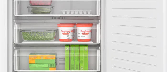 Внутреннее освещение холодильной камеры выполнено на светодиодах, что обеспечивает яркое и равномерное освещение. В морозильной камере предусмотрено три ящика, а также ванночка для льда. Система охлаждения NoFrost предотвращает образование инея, а автоматическая система размораживания облегчает уход за холодильником.