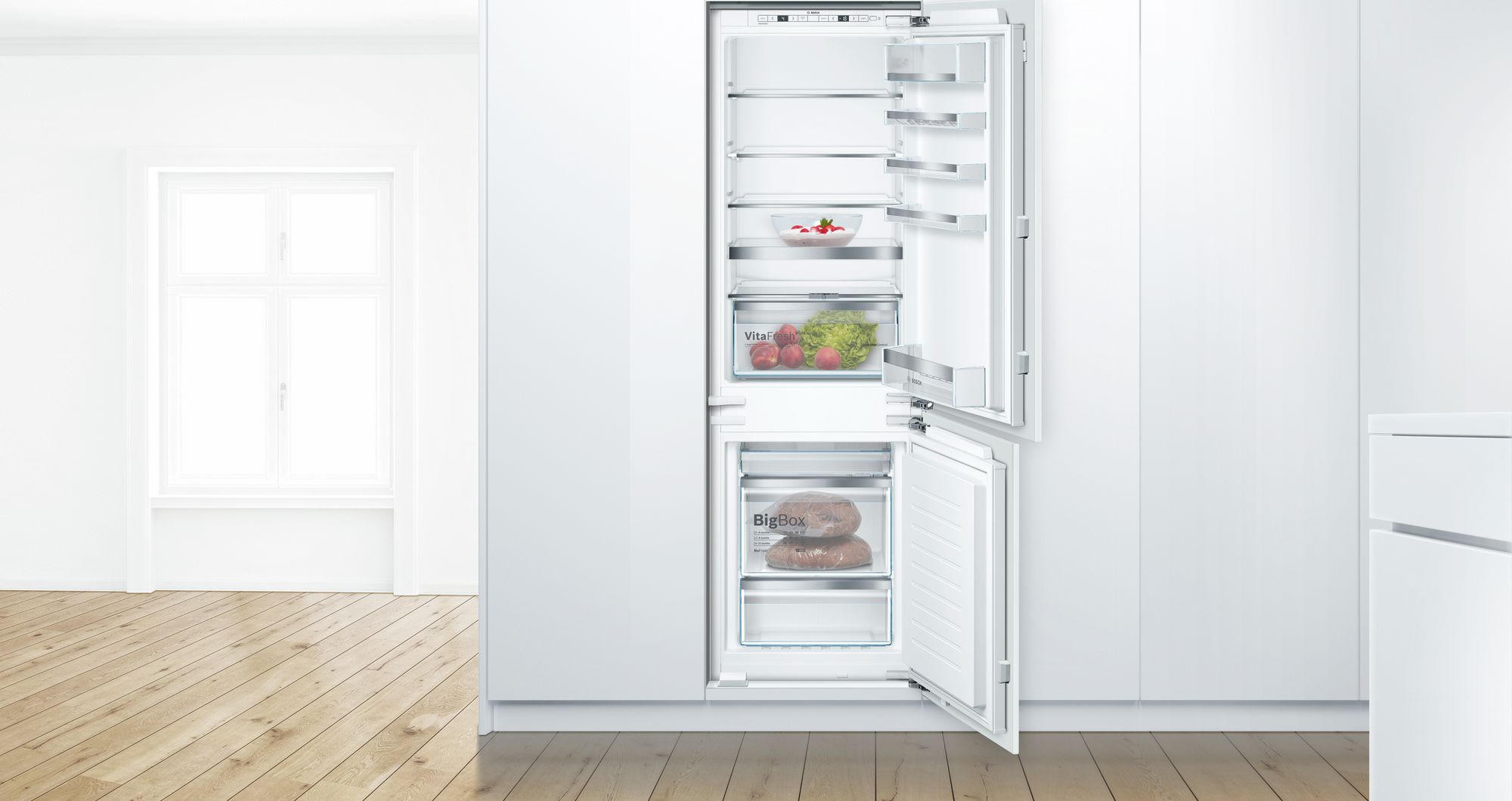 Двухкамерный холодильник Bosch KIN86HD20R — встраиваемая модель с зоной свежести VitaFresh plus. Светодиодная подсветка ярко и равномерно освещает холодильную камеру холодильника. Благодаря системе NoFrost нет необходимости в размораживании прибора. В морозильной камере расположен большой ящик для замороженных продуктов BigBox.