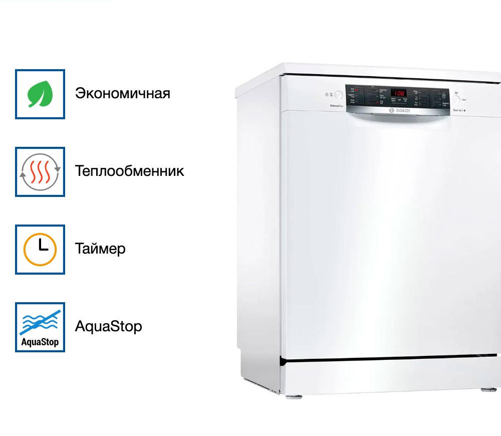 Посудомоечная машина Bosch SMS46NW01B из серии Serie | 4 выделяется лаконичным дизайном и практичной функциональностью. Её светлый корпус с белой панелью управления обладает нейтральной, успокаивающей эстетикой, которая легко вписывается в любую кухню — от современной до традиционной. Такой подход делает технику не просто бытовым прибором, а гармоничной частью интерьера.