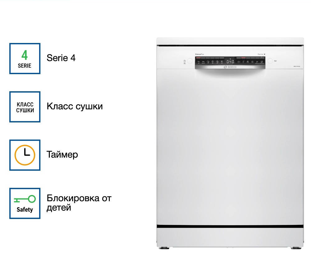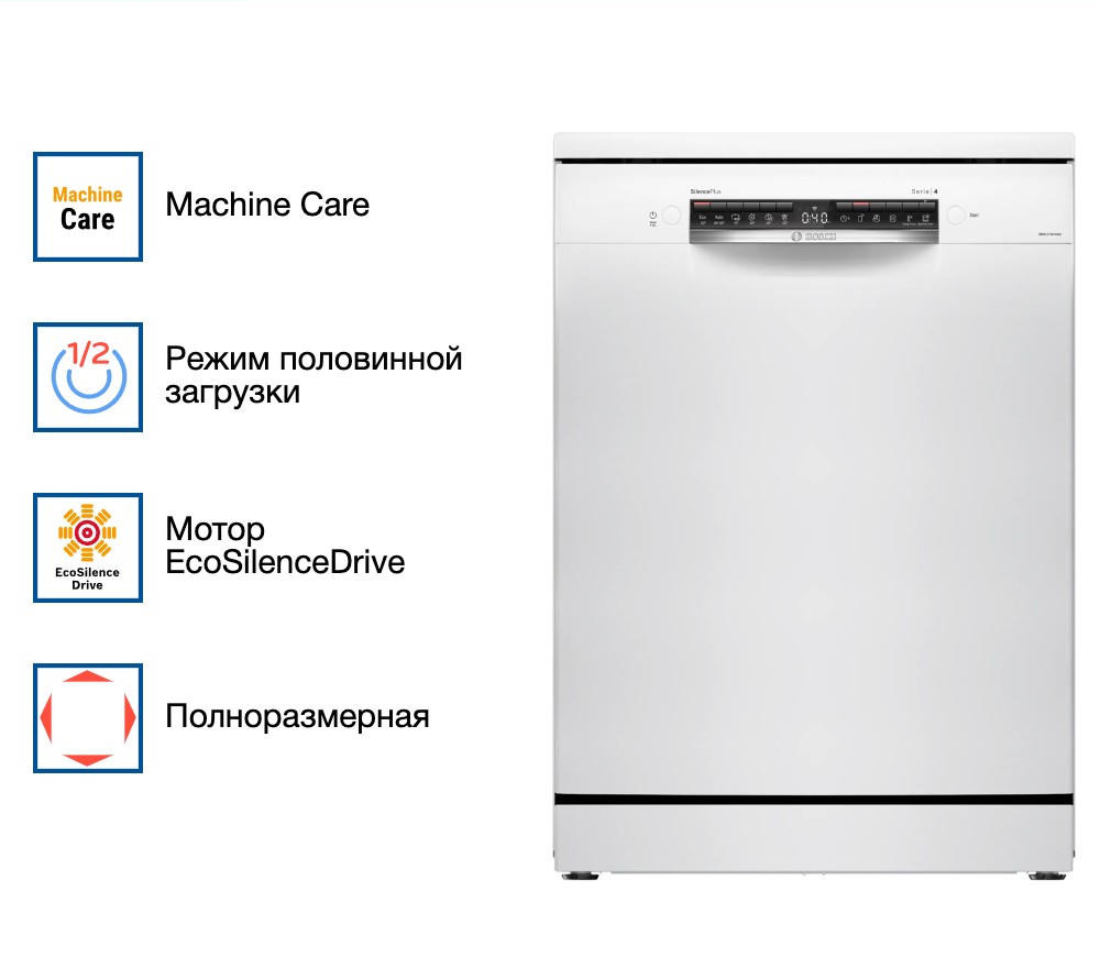 Посудомойка Bosch SMS4ECW26M — это та техника, что делает порядок на кухне почти незаметным. Её светлый, нейтральный фасад легко вписывается в любой интерьер — от строгого минимализма до уютной классики. Аккуратные пропорции и отдельностоящая конструкция позволяют поставить её без сложных врезок: просто подключили — и готово. Она не требует особого внимания, но при этом решает одну из самых рутинных задач без лишнего шума.