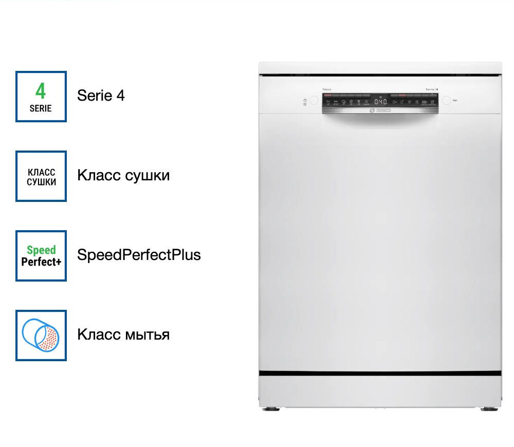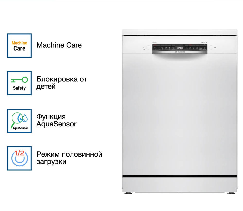 Посудомоечная машина Bosch SMS4HVW00E отличается своим стильным дизайном и функциональностью. Это отдельностоящая полноразмерная модель с конденсационной сушкой, выполненная в классическом белом цвете, что позволяет ей гармонично вписываться в любой интерьер. Серия Serie | 4, к которой принадлежит данная модель, зарекомендовала себя как надёжная и функциональная техника. Машина оснащена стандартным двигателем, способным обеспечить долгий срок службы прибора. Модель обладает широким набором программ стирки: в наличии шесть стандартных программ и четыре температурных режима. Такой выбор позволяет подобрать наиболее подходящий режим для различного типа посуды.