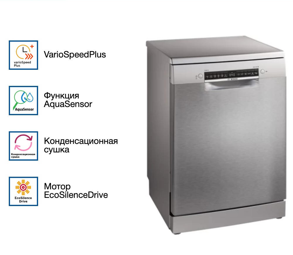 Посудомоечная машина Bosch SMS4IMI62Q — это современная, функциональная и надежная модель, которая станет незаменимым помощником на вашей кухне. Произведенная в Турции, эта машина обладает прочным корпусом из нержавеющей стали, что гарантирует долговечность и стойкость к коррозии. Вместительность модели составляет 14 комплектов посуды, что позволит с легкостью уместить все необходимые кухонные принадлежности. Отдельностоящая конструкция обеспечивает удобство установки и использования машины. Серия Serie | 4, к которой относится данная модель, заслужила признание пользователей за свои высокие технические характеристики и надежность. Система сушки в машине конденсационная, что обеспечивает быстрое и качественное высыхание посуды после мойки. Вместе с инверторным двигателем EcoSilence Drive, который известен своей тихой и эффективной работой, машина обеспечивает отличные результаты мойки при минимальном уровне шума.