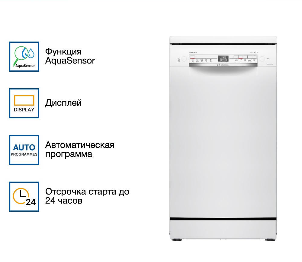 Модель относится к узким и отдельностоящим, что делает ее идеальным выбором для небольших кухонь или для тех, кто хочет экономить пространство. При этом, несмотря на свои компактные размеры, машина способна вместить до 10 комплектов посуды, что позволяет справиться даже с большим количеством грязной посуды после праздничного ужина. Особенностью данной модели является использование теплообменника для сушки посуды. Этот метод сушки более мягкий и экологичный, поскольку он использует остаточное тепло от последнего цикла мойки. Это не только экономит энергию, но и предотвращает появление на посуде разводов и пятен.