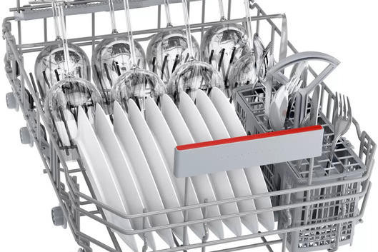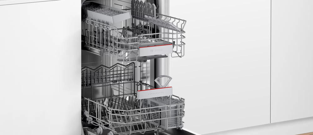 Встраиваемая посудомоечная машина Bosch SPV4EKX60E выполнена в белом цвете и имеет следующие габариты: высота — 81,5 см, ширина — 44,8 см, глубина — 55 см. Она рассчитана на 9 стандартных комплектов, в которые входят тарелки, чашки и приборы; если вам нужно будет положить кастрюлю, противень или подобные крупные предметы, общий объем загрузки уменьшится. Всего в машину встроено 6 программ и 4 температурных режима, например, интенсивная, быстрая, ночная, деликатная. Быстрая программа позволяет добиться превосходных результатов мытья и сушки посуды всего за 58 минут.