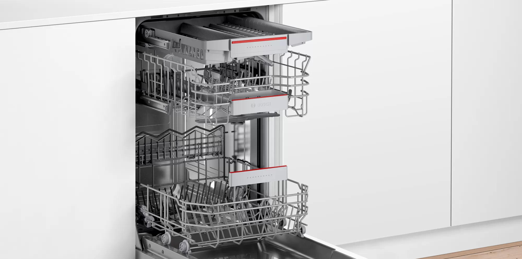 Встраиваемая посудомоечная машина Bosch SPV6ZMX01E выполнена в белом цвете и имеет следующие габариты: высота — 81,5 см, ширина — 44,8 см, глубина — 55 см. Она идеально подойдет для небольшого помещения и рассчитана на 10 стандартных комплектов. Если вы хотите, чтобы прибор закончил или начал свою работу к определенному времени, вы можете использовать функцию «Отложенный старт». Мытье посуды с помощью данной функции можно отложить от 1 до 24 часов.