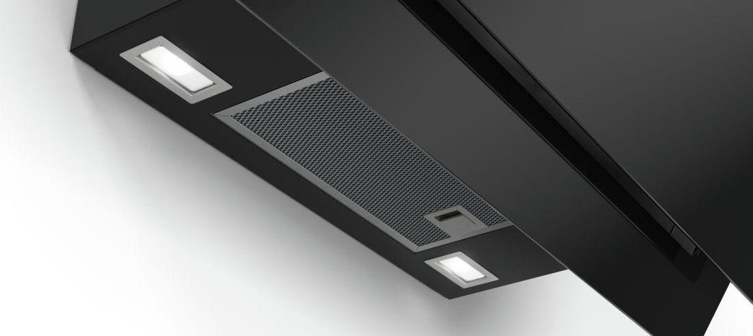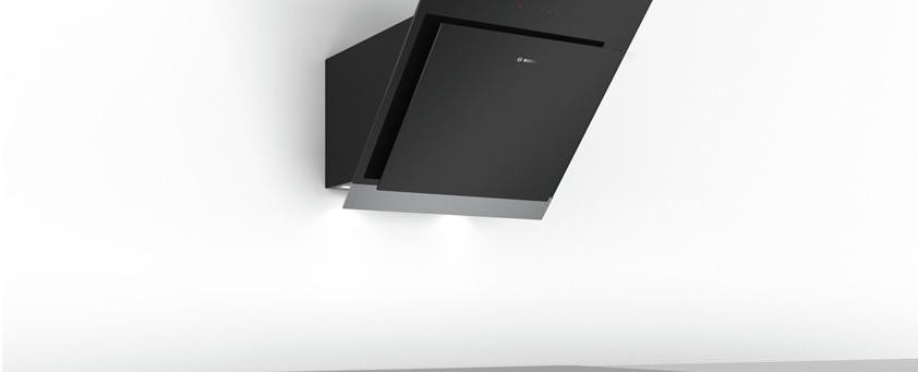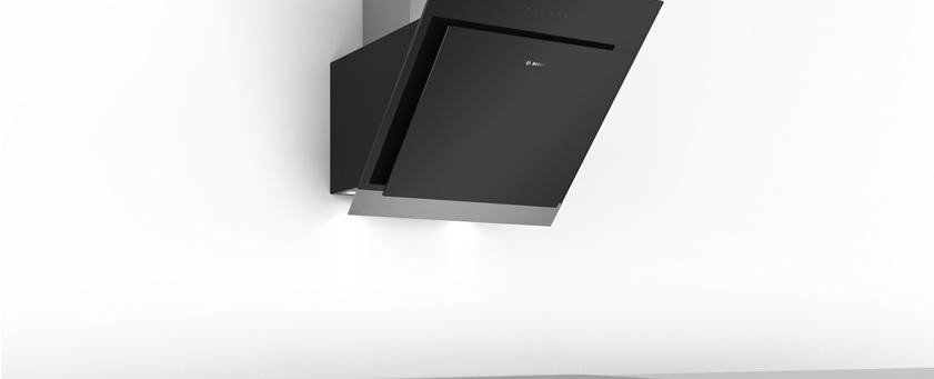 Наклонная вытяжка Bosch DWK 67HM60 эффектно смотрится в интерьере и удобна в использовании благодаря конструкции — передний край не перекрывает обзор. Забор воздуха производится по периметру прибора, что уменьшает уровень шума. Жировой фильтр закрыт стеклянным экраном. Сенсорное управление Touch Select расположено на передней панели, переключение скоростей и включение света производится легким касанием.