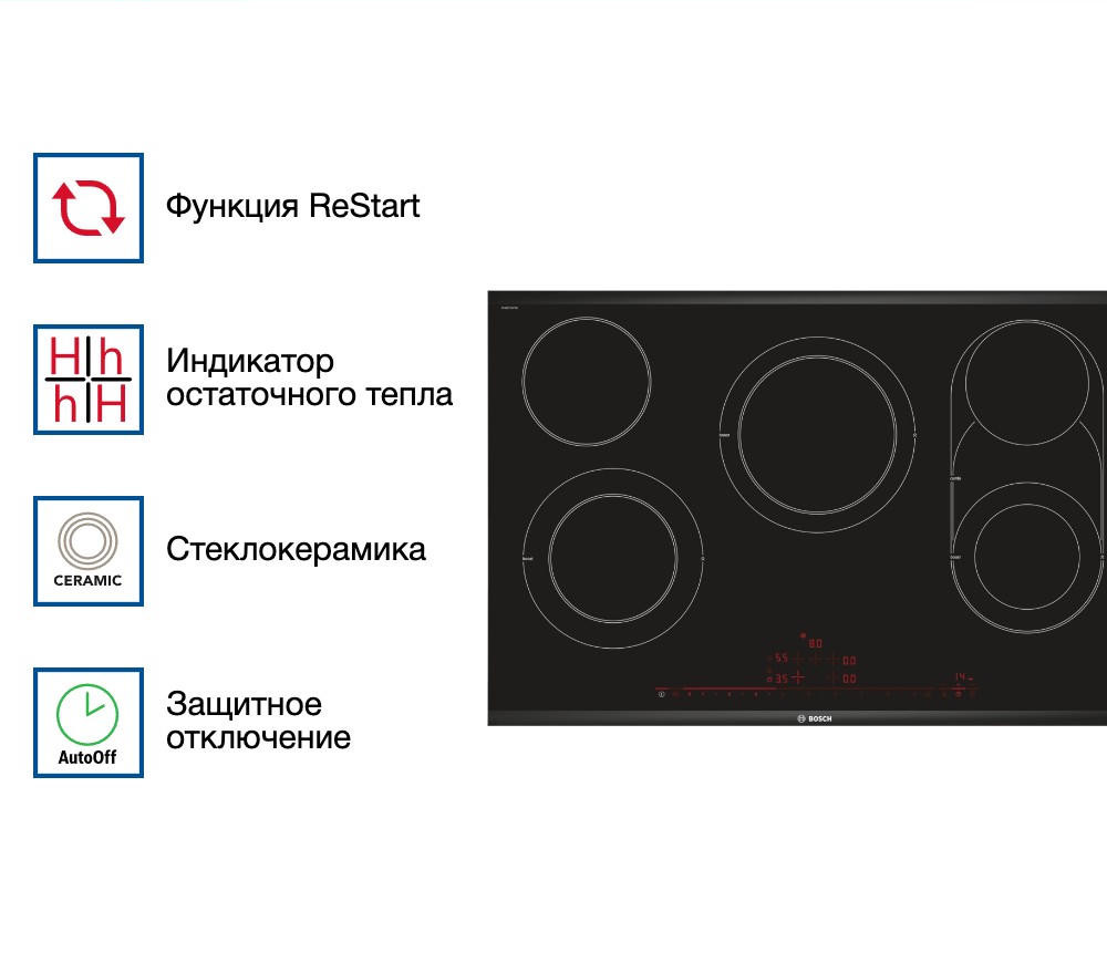 Удобство использования усиливается благодаря ряду полезных функций. Таймер прямого отсчёта позволяет задать необходимое время для каждой конфорки, а функция отключения автоматически завершает приготовление, предотвращая перегрев. Функция ReStart запоминает последние настройки в случае случайного отключения, а PowerBoost ускоряет процесс нагрева, экономя ваше время.