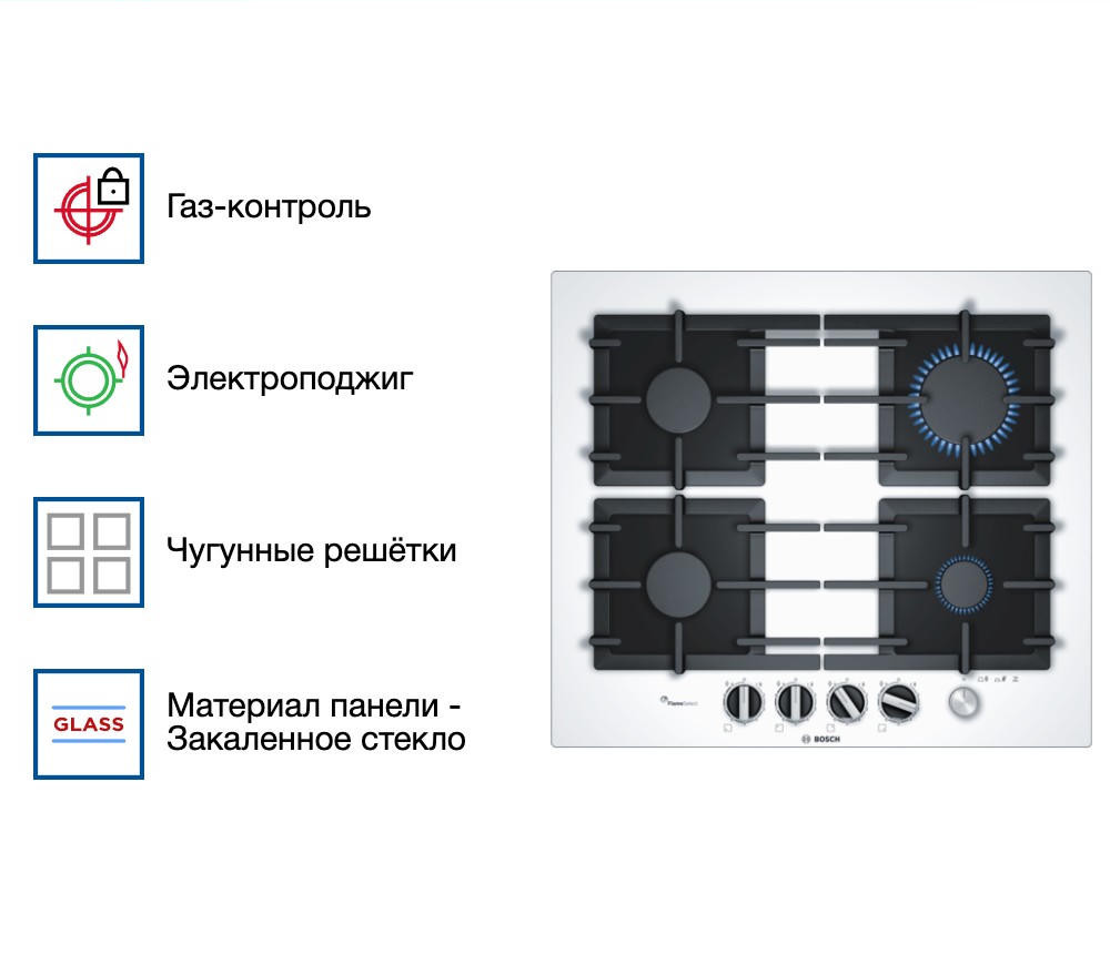 Варочная панель Bosch PPP6A2M90R независимая варочная поверхность, изготовленная из закаленного стекла HardGlass. Белое стекло удачно сочетается с черным цветом конфорок и массивной составной решеткой оригинальной формы. Устройство относится к дизайн-линии, которую отличает особая элегантность и удобство в управлении. Еще одна ее особенность — инновационные технологии. Модель оснащена функцией FlameSelect, позволяющей достигать лучших результатов приготовления. В соответствии с ней каждый из уровней мощности соответствует определенному способу приготовления, от бережного тушения до кипячения.