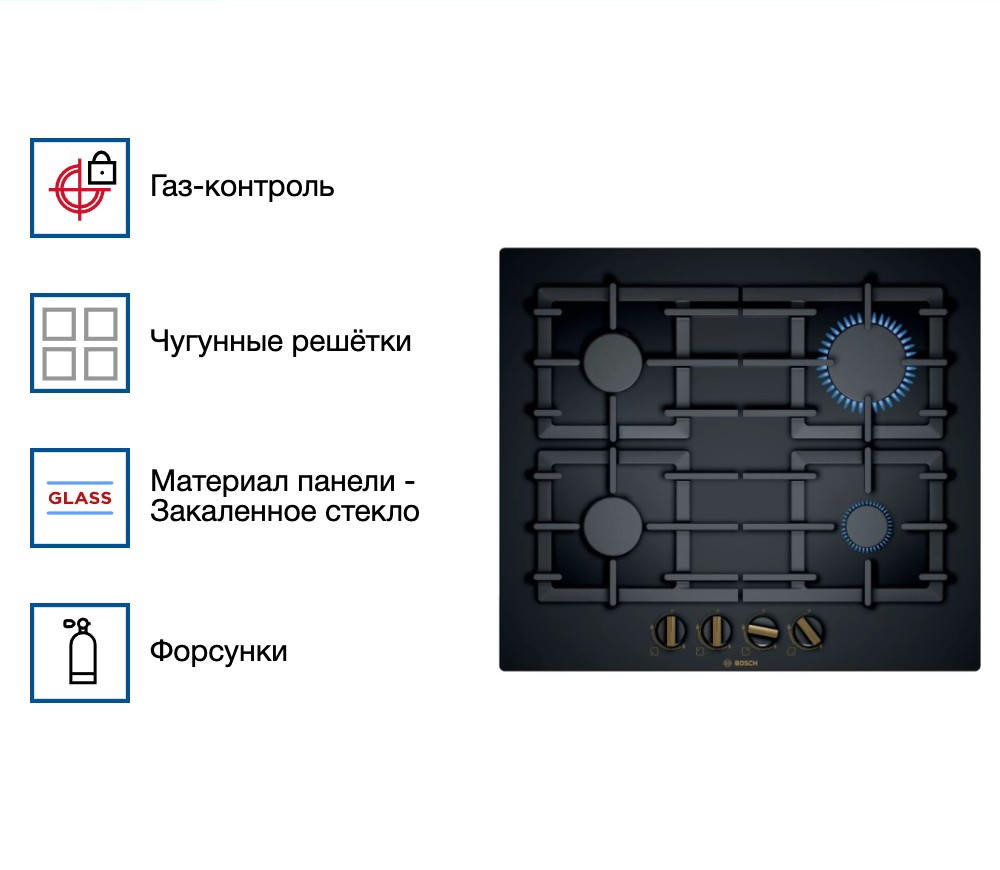 Безопасную эксплуатацию газовой варочной панели осуществляет система газ-контроль, которая подразумевает, что благодаря специальным датчику и клапану при случайном угасании огня газ мгновенно блокируется и перестает поступать — утечка предотвращена.