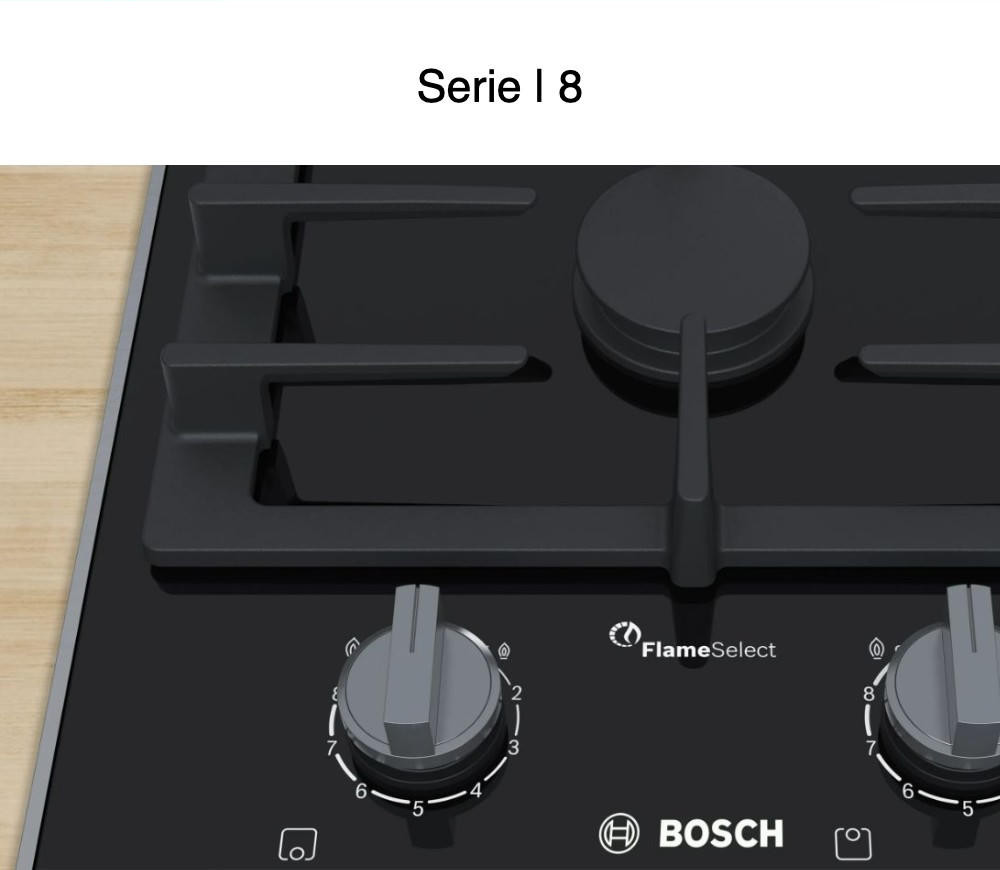 Варочная панель Bosch PRB3A6B70 представлена в черном цвете материал поверхности стеклокерамика. Имеется автоматический электроподжиг, он включается при повороте регулятора мощности. Есть защита при затухании пламя подача газа прекратится.