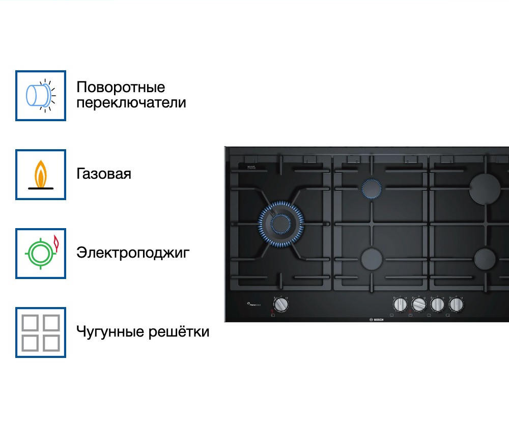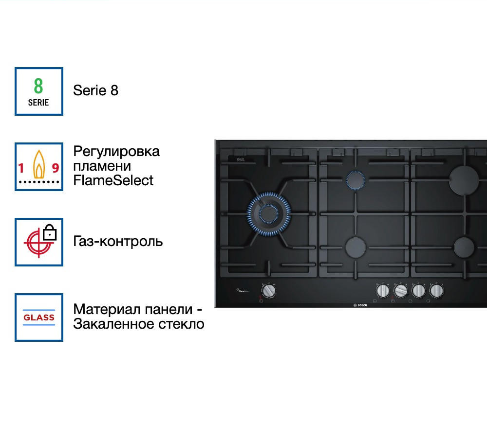 Встраиваемая газовая панель Bosch PRS9A6D70M из серии Serie | 8 - это сочетание элегантного дизайна и высокой функциональности. Она выполнена в строгом черном цвете, что делает ее универсальным элементом для любого интерьера кухни. Поверхность панели изготовлена из закаленного стекла, что обеспечивает ее долговечность и легкость в уходе. Чугунные решетки добавляют устройству прочности и надежности.