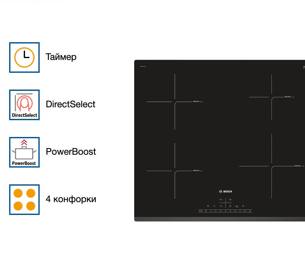 Выбор из 17 ступеней мощности позволит точно отрегулировать нагрев, а сенсорное управление DirectSelect обеспечит комфорт при настройке прибора. Если вдруг понадобится увеличение мощности (например, нужно быстро нагреть большой объем воды), то к вашим услугам режим PowerBoost, на короткий срок усиливающий нагрев одной конфорки за счёт другой, неработающей.