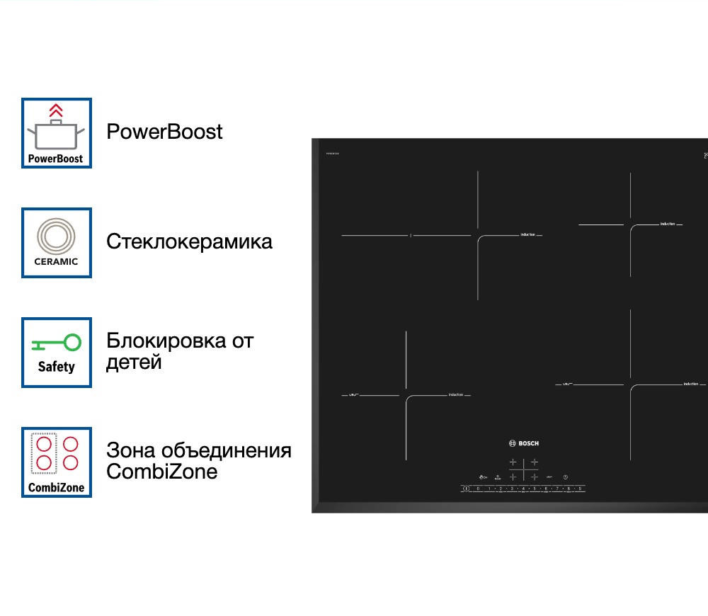 Техника оснащена четырьмя индукционными конфорками различной мощности, что позволяет выбрать оптимальный режим для приготовления различных блюд. Функция PowerBoost обеспечивает ускоренное нагревание, сокращая время приготовления. Функция ReStart позволяет восстановить последние настройки в случае отключения питания. Функция PowerManagement автоматически регулирует мощность в соответствии с потребностями приготовления пищи.
