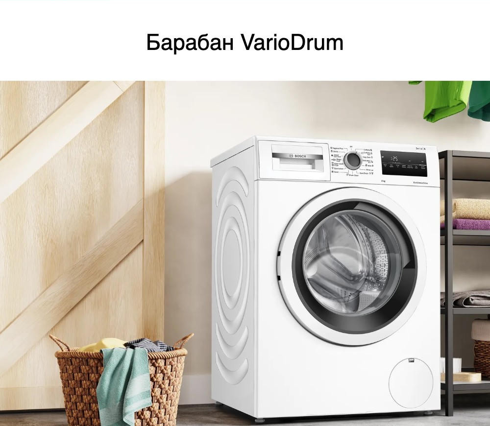 Барабан рассчитан на загрузку до 8 кг, что оптимально для семьи из 3-4 человек. Фронтальная загрузка обеспечивает удобство при закладке и извлечении вещей. За бесшумную и плавную работу отвечает инверторный мотор EcoSilenceDrive — он не только снижает уровень шума, но и увеличивает срок службы техники. Управление осуществляется через интуитивно понятную электронную панель с поворотным селектором и сенсорными элементами. Информативный LED-дисплей отображает текущий этап цикла, оставшееся время, рекомендованную загрузку и данные о работе системы SmartEcoControl, отвечающей за энергоэффективность.