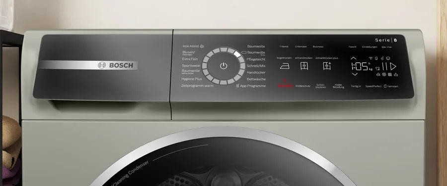 Максимальная загрузка составляет 9 кг, что позволяет сушить большое количество белья за один цикл. Электронное управление с сенсорными элементами Touch control обеспечивает простоту и удобство использования. На LED-дисплее отображается вся необходимая информация, включая индикацию заполнения ворсового фильтра и контейнера для конденсата. Одной из особенностей модели является функция отложенного старта до 24 часов, позволяющая запланировать сушку на удобное время. В ассортименте 14 программ сушки, включая специальные режимы для хлопка, синтетики, рубашек, спортивной одежды, тонкого и смешанного белья, полотенец, шерсти и деликатного белья. С помощью функции AutoDry можно автоматически установить оптимальное время сушки.