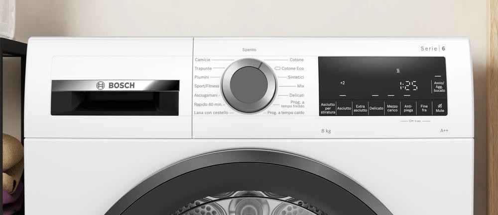 Сушильная машина Bosch WQG23100IT обладает антивибрационным дизайном, боковые стенки по бокам гасят вибрацию при работе. Имеется быстрая программа, которая за 40 минут высушит небольшие количества вещей. Система Auto Dry автоматически определяет сухость и влажность вещей, благодаря температурным датчикам.