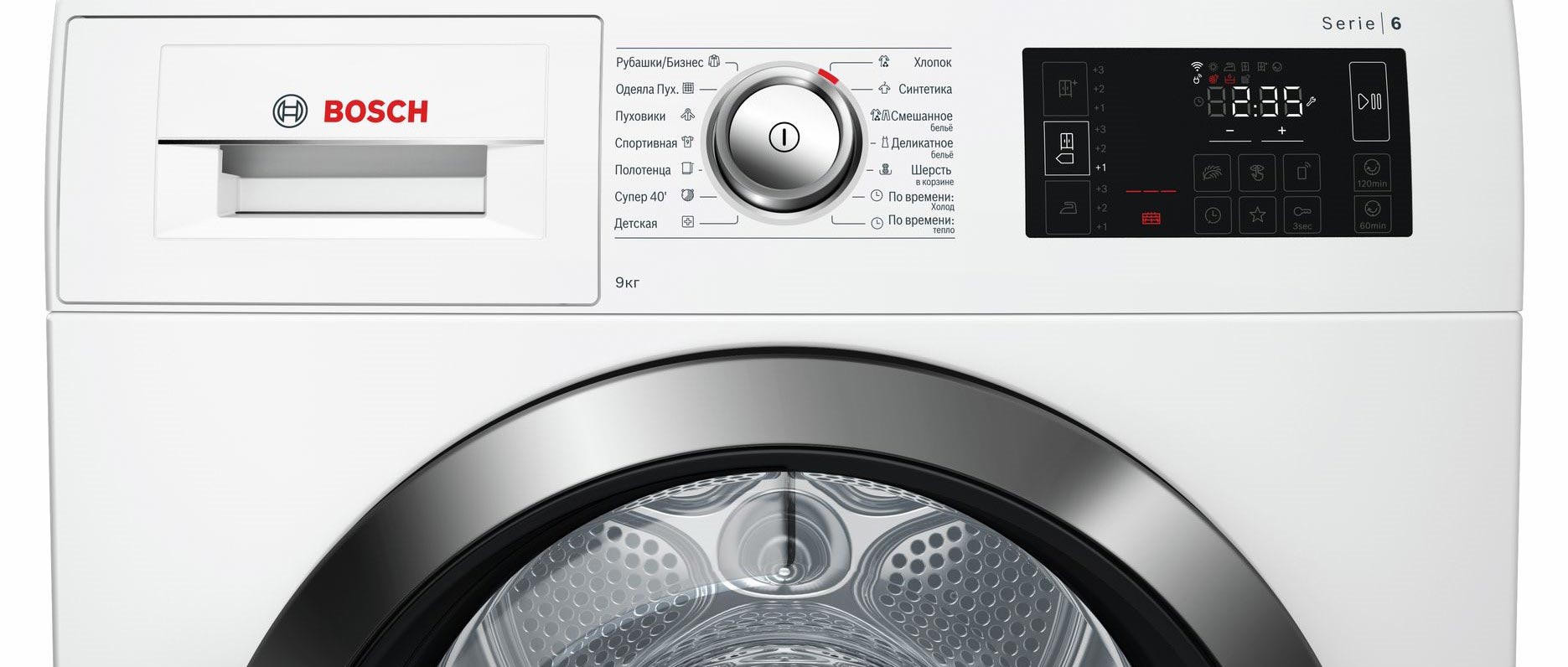BOSCH WTW876H0OE имеет конденсационный тип сушки с применением теплового насоса, что значительно увеличивает эффективность процесса и снижает потребляемый расход энергии. Стандартный двигатель, проверенный временем, не дает сбоев. Максимальная загрузка составляет 9 кг. Класс энергоэффективности A++ позволит сократить траты на электричество. Электронное управление осуществляется по средствам поворотных переключателей и сенсорных клавиш Touch control. Большой многофункциональный LED-дисплей отображает необходимую информацию о работе. Барабан выполнен из нержавеющей стали устойчивой к воздействию влаги и высоких температур. Отвод конденсата может осуществляться напрямую в канализацию. По завершении цикла вы услышите приятный звуковой сигнал. Максимальное время отсрочки старта составляет 24 часа. В стандартный комплект входят корзина для сушки шерсти, самоочищающийся конденсатор и ворсовый фильтр. Гарантия от производителя составляет 12 месяцев.